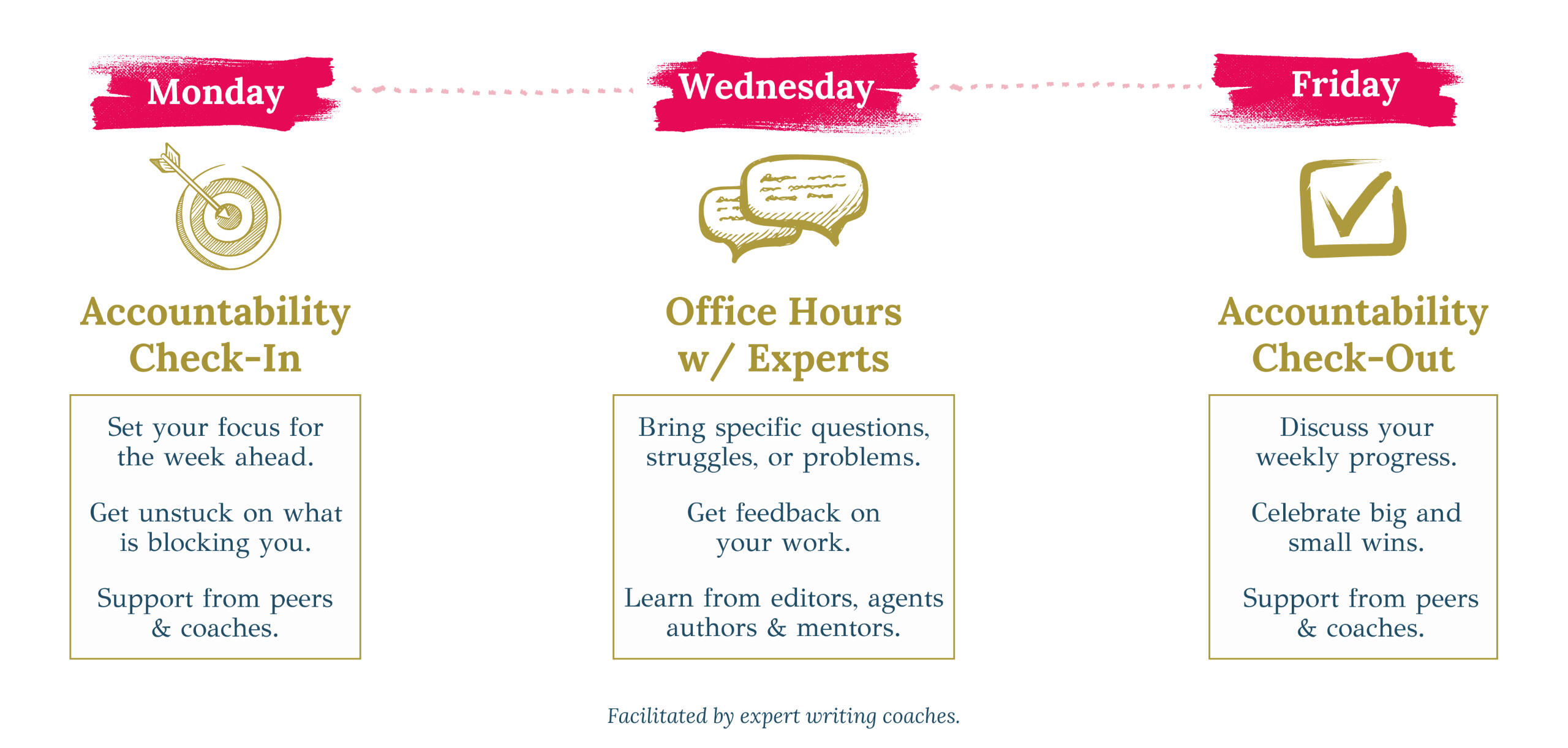 Weekly Structure, Expert Support & Peer Accountability to finish your writing projects on time.